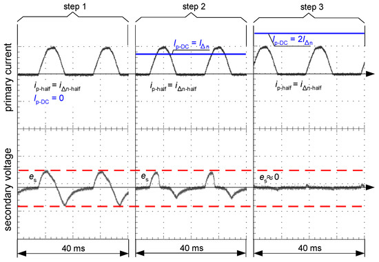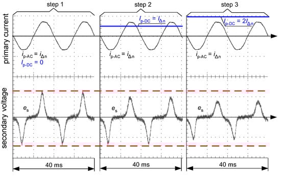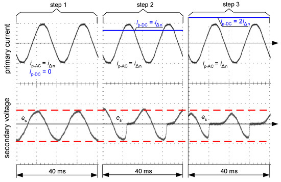 Oscillograms of the induced secondary voltage es in case of the iron core of flat hysteresis loop (as in Figure 15b). Primary current ip composed of sinusoidal AC waveform (ip-AC = i∆n) and DC component (Ip-DC) of the consecutive values: Ip-DC = 0 (step 1), Ip-DC = I∆n (step 2), Ip-DC = 2I∆n (step 3).