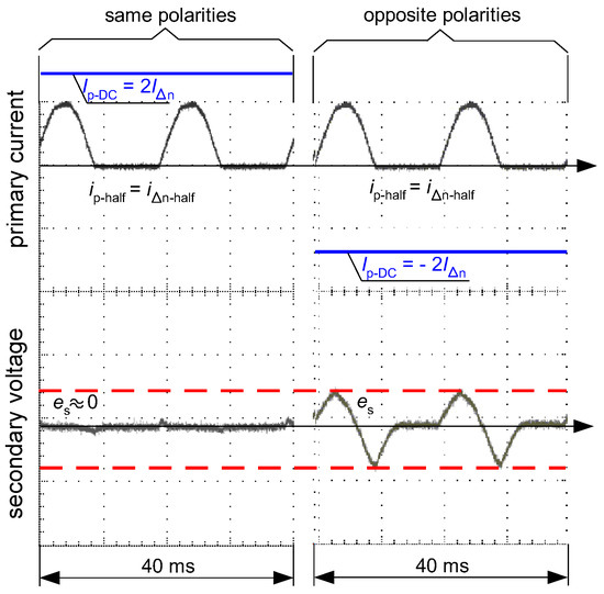Oscillograms of the induced secondary voltage es in case of the iron core of flat hysteresis loop (as in Figure 15b). Primary current ip composed of pulsating DC (half-wave) waveform (ip-half = i∆n-half) and DC component (Ip-DC) of the value: Ip-DC = 2I∆n. Case 1 (left)—same polarities of the components; Case 2 (right)—opposite polarities of the components.