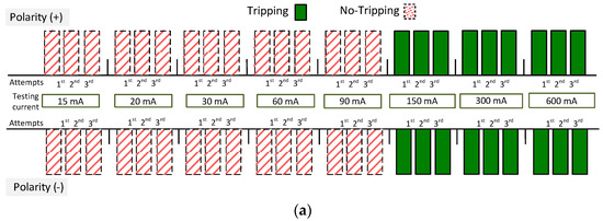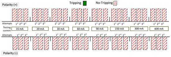 Selected results (the most interesting because they are varied) for four A-type RCDs are depicted in Figure 21; both F-type RCDs are depicted in Figure 22. The results in these figures are expressed in the form of bars. If the reaction of the RCD occurred, the annotation “Tripping” was performed—otherwise “No-Tripping” was noted. The testing of RCDs has been performed for both polarities of the direct current: (+) and (−). Moreover, for every polarity, each value of the current was forced three times (in Figure 21 and Figure 22 it is marked by bars “1st, 2nd, 3rd”) with an interval of around 20–30 s between consecutive attempts.