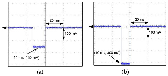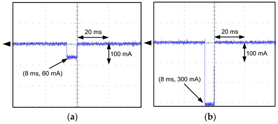 Oscillograms of the DC current flow during the tripping test of the A-type RCD (RCD30_6). Suddenly applied DC current of the following values: (a) 150 mA; (b) 300 mA.