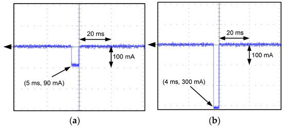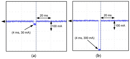 Oscillograms of the DC current flow during the tripping test of the A-type RCD (RCD30_8). Suddenly applied DC current of the following values: (a) 90 mA; (b) 300 mA.