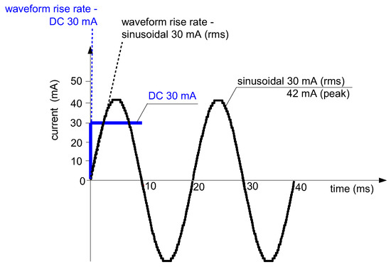 The rise rates of the sinusoidal 50 Hz AC (30 mA rms) and DC (30 mA) waveforms.