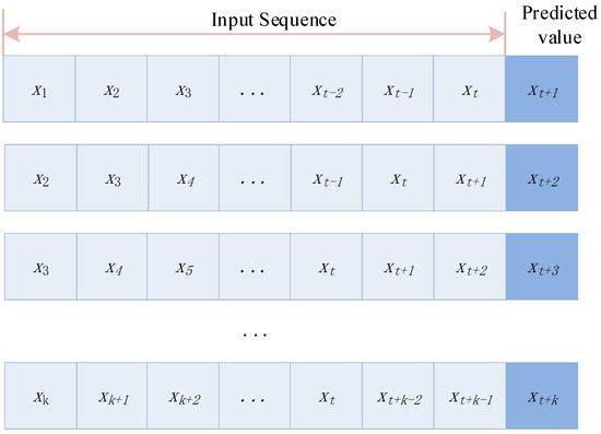 As the ARIMA model is not capable of multi-step forecasting, a rolling forecast is used for multi-step forecasting, and a schematic diagram of the rolling forecast is shown in Figure 3.