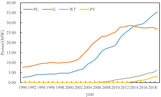 In Figure 4, blue is the historical output curve of gas turbines. It can be found that the output of gas turbines shows a downward trend from 2013 to 2019. The red is the wind power output curve, and the wind power output is in a high growth state. The yellow is the photovoltaic output curve, and the photovoltaic output is small, but the overall trend is still growing.