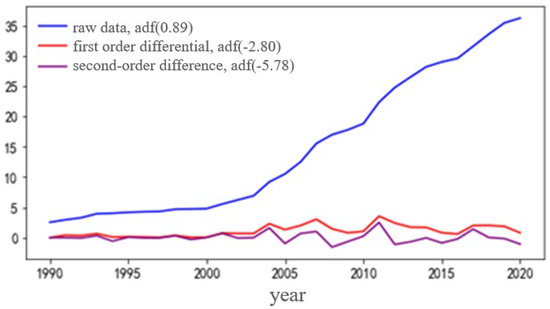 It can be seen from Figure 5 that the ADF unit root of the second-order difference sequence is −5.78 much smaller than the ACF unit root of the first-order difference and the original sequence, indicating that the stability of the second-order difference is stronger, and it can be seen that the values fluctuate around 0, so the difference coefficient d of ARIMA is 2.