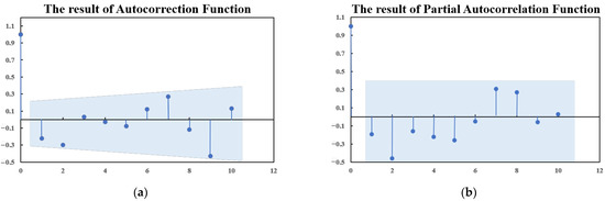 It can be seen from Figure 6 that both ACF and PACF are first-order truncations, that is the value of the sequence becomes very small after the first point, so p and q should be taken as 1. However, due to the subjectivity of using ACF and PACF to select p and q, p and q are corrected by Equations (12) and (13).
