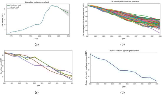 Gas turbine output prediction results. (a) Gas turbine prediction error band. (b) Gas turbine prediction scene generation. (c) Gas turbine output scenarios for the next 10 years after reduction. (d) Actual selected prediction curve of gas turbine.