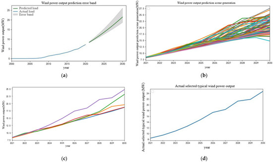 Wind power output forecast chart. (a) Wind power output prediction error band. (b) Wind power output prediction scenario generation. (c) Wind power output scenarios in the next 10 years after reduction. (d) Actual selected wind power output scenarios.
