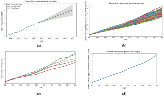 Photovoltaic output prediction results. (a) Photovoltaic output prediction error band. (b) Photovoltaic output prediction scenario generation. (c) Photovoltaic output scenarios for the next 10 years after reduction. (d) Actual selected photovoltaic output scenarios.