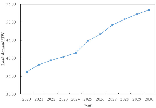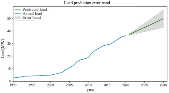 The network search method is used to search and traverse between p ∈ [0, 5] and q ∈ [0, 5]. Finally, the minimum AIC is 72.227 when p = 0, q = 2, so the ARIMA (0, 2, 2) model is finally established. The model is trained, and the load data for the next 10 years are predicted. The results are shown in Figure 10.