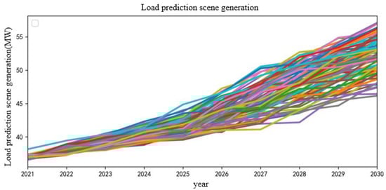 From Figure 10, it can be seen that the load in the region will show an increasing trend in the next 10 years, and its value fluctuates within the error range that satisfies the Gaussian distribution. After processing by this method, the final load scenario of node 1 in the next 10 years is shown in Figure 11.
