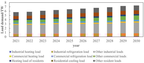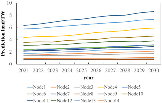 It can be seen from Figure 14 that the load of each node is on the rise, with nodes 1, 4, and 7 showing a large increase and the other nodes showing a slow growth trend in load. At the same time, in order to study the composition of each node load, the proportion of industrial heating load, industrial refrigeration load, other industrial load, commercial heating load, commercial refrigeration load, other commercial load, residential heating load, residential refrigeration load and other residential load of each node from 2010 to 2020 is analyzed, and the proportion distribution of each node load in the next 10 years is analyzed by statistical method. For the load with obvious change trend, the mean and variance of its growth rate are calculated, and the growth rate at time t + 1 is randomly selected by using the 3σ principle. For the load with no obvious change trend, the mean and variance of its proportion are counted, and the proportion at t + 1 is randomly selected by using the 3σ principle. The specific formula is as follows: