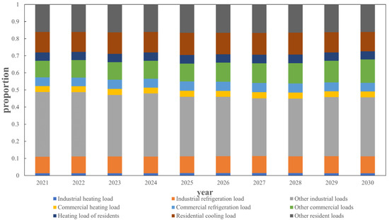 where , denote the load values with obvious proportion changes at tome t + 1 and t, denotes the load value whose proportion change is not obvious at time t + 1, rP,mean and rP,std denote the mean and variance of the obvious load growth rate of the proportion change, Pno,mean and Pno,std denote the mean and variance of the load with no obvious change in the proportion, and random (*) is a random function. The proportion of each type of load at node 1 from 2021 to 2030 is obtained through the appeal method, as shown in Figure 15 and Figure 16.