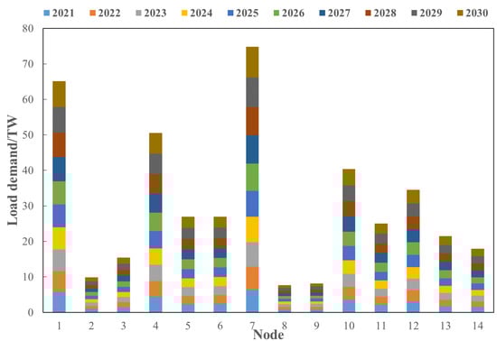 In this example, the load demand of each node is equivalently converted from the predicted load of typical areas. Among them, nodes 1, node 5, node 6, node 7, and node 10 are mainly industrial loads, and the total load of nodes 1 and 7 is higher among all nodes. The total load of nodes 2, 8, and 9 is lower, the economic growth of the region represented by node 2 is slower, and the commercial and industrial loads account for a more average share. Nodes 8 and node 9 are relatively small and dominated by commercial loads due to their geographical location; load distribution and the total amount of remaining nodes are more uniform.
