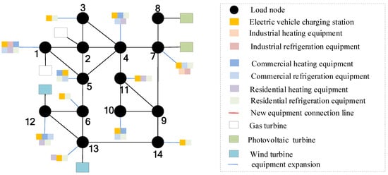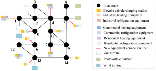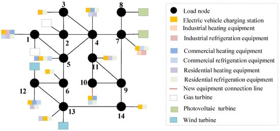 Aiming at the source–load demand from 2021 to 2030 predicted in Section 3.2, based on the IEEE 14-node distribution system, the evolution route of the distribution network in the next ten years is analyzed under the predicted typical source–load scenarios. The node source–load data of the 14-node distribution system is shown in Figure 17.
