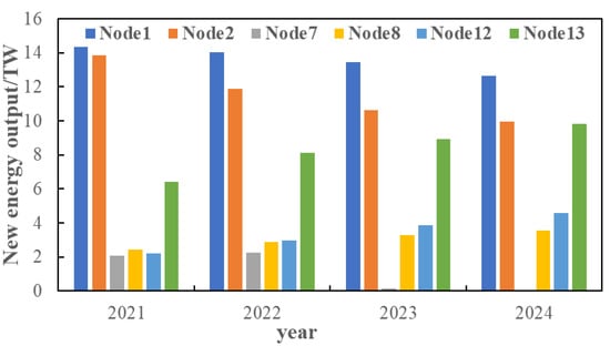 It can be seen from the above that 2024 is a time cross-section of load change. Before 2024, the load growth trend is relatively flat. According to Table 1, compared with the single-stage planning evolution, the equipment configuration capacity is smaller. Therefore, the power output is dominated by the gas turbines at node 1 and node 2, with a smaller output from the new energy units, and the output of each unit can meet the load demand at each node of the distribution network.