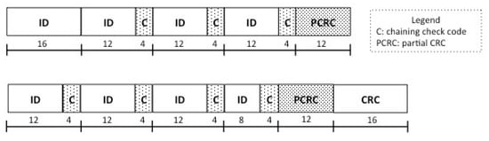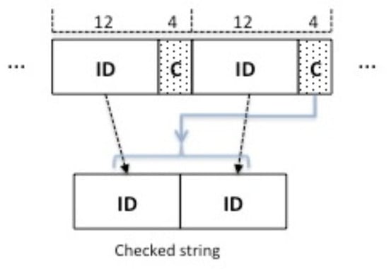 The merging problem is addressed through check codes. The EPC ID is partitioned into a first block of B bits, plus multiple blocks of (B-D) bits, concatenated with D bits of chaining check code. Figure 1 represents an example with and . Chaining check codes are related to the current and previous blocks, and allow the possible combinations of recovered tag IDs to be pruned. At each round, starting from the second one, we consider the string obtained by concatenating the previous and current ID blocks (see Figure 2). Then, we apply the operation to the rest of the division between the previous block and the current one. The result is compared with the chaining code; only the blocks successfully matching the code are inserted into the candidate ID set. When the candidate set has a cardinality greater than a given threshold (e.g., 2000 candidates), we perform a Partial Cyclic Redundancy Check (PCRC) round, in which the recovered block is a Cyclic Redundancy Check (CRC) code (for example, of 12 bits), related to the ID substring recovered and merged thus far. The merging process ends with a final check performed with a global CRC code of size 16 bits, as specified in [3], which is sent in the last block and related to the entire EPC ID. This process builds EPC IDs in an incremental way; at each round i, the IDs in the candidate set have length roughly equal to i times the size of each block (B-D bits).