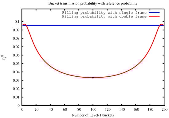 where is the probability for a bucket to be filled with one or more transmissions. We exploit the fact that selections in the two frames are independent from one another.