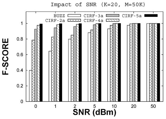 To evaluate resilience to noise, we varied the SNR from 0 dBm to 50 dBm and evaluated the F-score for Buzz (single antenna) and CIRF equipped with different numbers r of antennas (). We use the notation CIRF-ra to indicate that the CIRF protocol uses r antennas. The number of tags K is fixed at 20, and the number of measurements M is fixed at 1000 (50 times the number of tags), including bucketing and recovery. The results are shown in Figure 4. For high SNR, there is a small difference in F-scores for Buzz and CIRF that is not substantial; as the SNR is reduced, the difference becomes significant. At an SNR of 0dBm, the F-score for Buzz is only 0.4, whereas the F-score for CIRF with four or five antennas is more than 0.97. This is a significant difference; on average, the number of false positives with Buzz is roughly 12, whereas the number of false positives with CIRF (with five antennas is roughly , which translates into substantial savings in further rounds. The difference between Buzz and CIRF is substantial for SNRs up to about 10 dBm, after which the schemes are closer to each other. Thus, there is a significant improvement in resilience when using multiple antennas in a range of low to medium SNR situations.