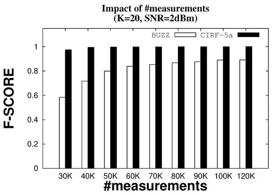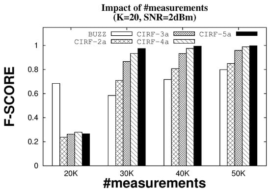 Even with a massive increase in the number of measurements from 30 K to 120 K, Buzz fails to recover all the tag IDs. Figure 6 compares the F-scores for Buzz and CIRF while fixing the number of nodes and the dBm. The F-score for Buzz converges to , and never reaches full reliability (F-score = 1). However, CIRF with five antennas reaches an F-score equal to 1 at 50 K measurements.