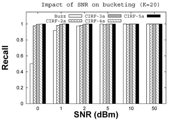 The use of multiple antennas for sparse recovery makes bucketing resilient against noise. Figure 7 shows how recall varies when increasing the SNR. Note that recall in this case relates to buckets instead of tags; losing a bucket translates to losing one or more tags, as multiple tag IDs may fall in the same bucket. When the SNR is very low (i.e., 0 dBm), Buzz bucketing performs poorly (recall is 0.47), while CIRF bucketing shows high accuracy (recall is more than 0.99) with four or five antennas. The difference is significant, as the number of false negatives with Buzz is 10 at an SNR of 0dBm, which translates into missed tags in the identification phase (i.e., the columns corresponding to those buckets are not inserted in the A matrix). In the case of CIRF with five antennas, the number of false negatives is 0. Buzz remains inaccurate up to 2dBm, losing one bucket, while CIRF bucketing is accurate. The two systems are comparable starting from the value of 5 SNR, when Buzz achieves accuracy as well.