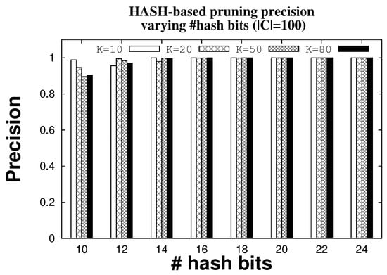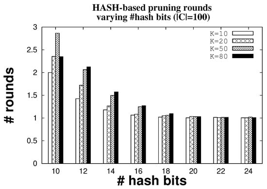 We use hash functions and block sparsity estimation for reliable identification. In order to better understand how many hash rounds we need to execute to mop up false positives, we plot the number (indicated by the symbol #) of rounds by varying the length of the hash functions. Figure 8 shows the trend for 10, 20, 50, and 80 tags when the candidate ID set has cardinality fixed to 100 and the number of antennas is five. The mechanism is reliable. For instance, on average it takes only 1.25 rounds to remove fifty FPs when there are K = 50 tags in the system and 16 bits of hash. Increasing the length of the hash functions is one way to reduce the number of rounds; with 24 bits of hash, roughly one round is sufficient to remove all FPs. The system is precise in removing all FPs when there are at least 16 bits in the hash. Figure 9 shows that hash-based pruning is always precise for hash length greater than 16 with any network size.