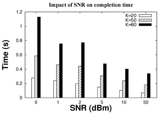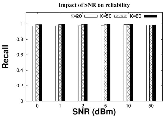 Finally, we evaluate the overall efficiency of our scheme. In terms of time, CIRF efficiency depends on the execution of multiple sparse recovery stages (ID substring recovery plus the final mop-up hash-based mechanism). Figure 10 shows the time (in seconds) for the CIRF protocol to identify all tags and remove FPs. In the case of a small network and high SNR (K = 20, SNR = 50), CIRF is able to identify all tags in less than s. When increasing the network size to 80 tags, our system requires only s. CIRF is efficient in the case of very high noise (SNR = 0 dBm); although it requires more measurements, the time required to recover all tag IDs only increases to s (K = 20). Larger network sizes require more time; for example , seconds to identify 80 tags. However, this is a very short time considering the presence of very high noise (SNR = 0 dBm).