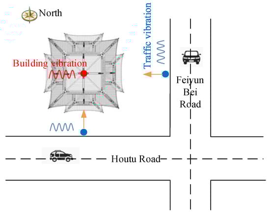As demonstrated in Figure 11, Feiyun Pavilion is only 10 m away from Houtu road in the south and close to Feiyun Bei road in the east. The long−term wind, rain erosion, and the impact of traffic vibration have made damages to Feiyun Pavilion up to a certain extent. Therefore, it is necessary to predict the vibration of the Feiyun Pavilion under the action of traffic loading.