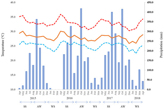 Agronomic data were used and collected from field experiments that were carried out at six locations in the full-dike areas (Chau Thanh, Cho Moi, Thoai Son, Tri Ton, Chau Phu, and Tinh Bien) across An Giang Province, Vietnam (Figure 1). A total of 36 experimental field data from Chau Thanh, Cho Moi, and Thoai Son were as the same as those used by Uno et al. (2021) []. An additional 46 experimental field data were collected to cover the whole An Giang Province with same method as that used by Uno et al. (2021) []. Six locations were selected according to their different soil types and the skills of the farmers, who can manage two water management schemes, including CF and MD, allocated to two neighboring fields managed by the same farmer at each location. Agronomic data were collected over three rice growing seasons: the spring–summer season (SS, April–August), autumn–winter season (AW, August–December), and winter–spring season (WS, winter–spring, December–April) from April 2015 to April 2018. The monthly temperature and precipitation in An Giang Province during the whole experimental period are shown in Figure 2. In the target region, there is usually a 4–5-month dry season from December to April, sometimes including May, and a 6–7-month rainy season from May to November (Figure 2). A direct sowing method was used, with the selected rice variety based on the recommendations of agricultural extension centers for each cropping season (Table 1). Fertilizer was applied based on the rice variety and soil fertility of each location, but the applied amounts were similar between the two water management practices (Table 1). All the other agronomic practices, such as the soil preparation, including the management of the rice straw and pest and disease control, were also consistent with the conventional local practices of farmers and conducted with the help of extension center staff. Consequently, the applied fertilizer rates and straw management approaches varied across seasons and locations. The locations, soil types, rainfall, and field management practices are listed in Table 1. In total, 82 field data were collected, including both the CF and MD water management schemes. Every morning, the farmers measured the water level using a water gauge formed of a polyvinyl chloride pipe that was installed near the GHG measuring area in each rice cultivation field. The gauges were installed to measure the water level 15 cm below the soil surface. Following to the method described by Taminato and Matsubara (2016) [], GHG measuring was conducted every week in three replications over a 1 m × 1 m area in each rice cultivation field. The harvest was conducted in the same area as the GHG measuring point, avoiding poor or over-luxuriant growth. After wind drying, the paddy rice yield was calculated through the calibration of the moisture content. The average values of the water level, rice yield, and GHG emissions such as CH4 and nitrous oxide (N2O) were used for further analyses to investigate the relationships between them.