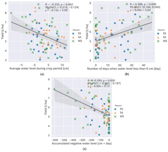 Relationship between the rice yield and water level during the crop cultivation period. (a) Average water level during the crop cultivation period (cm); (b) days of negative water levels during the crop cultivation period (days); (c) accumulated negative water level during the crop cultivation period (mm). Circles, triangles, and crosses show data from the spring–summer (SS), summer–autumn (SA), and winter–spring (WS) seasons, respectively.