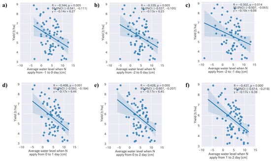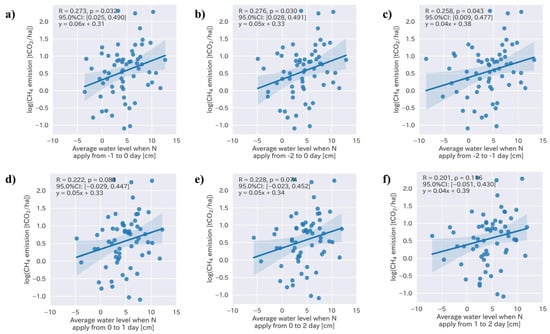 Specific water management practices were observed to reduce the CH4 emissions in different crop seasons (Figure 5 and Figure 6). The average water level during the cropping period, number of days when the water level was less than 0 cm, and accumulated negative water level exhibited significant correlations with the CH4 emissions (R = 0.433, −0.433, and 0.324, respectively, with p-values < 0.01). In addition, the average water level during the cropping period (Figure 5a) exhibited a significant correlation with the CH4 emissions. Tt could reduce the CH4 emissions by 9% when the average water level was 1 cm lower during the whole crop season. The number of days of non-flooded soil (Figure 5b) also exhibited a significant correlation with the CH4 emissions, which could potentially be reduced by 3% when it was increased by 1 d during the whole cropping period, from sowing to the final water drainage. Furthermore, there was a correlation with the accumulated negative water levels during the cropping period, although it was smaller than the above-mentioned water levels (Figure 5). The average water levels before and two days after the nitrogen fertilizer application were also analyzed. Only the average water level before the nitrogen fertilizer application showed the highest correlation with the CH4 emissions (Figure 6; R = 0.268–0.276 with p-values < 0.05), which implies that the water level management at 1–2 days before nitrogen fertilization could potentially reduce GHG emissions by 4–6% when the water level was 1 cm lower (Figure 6a–c).