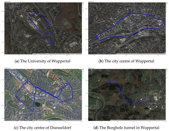 A total of four different test regions were selected based on varying levels of traffic congestion, challenges to signal availability due to the presence of tall buildings and trees in the region. The path driven by the vehicle in these test regions are shown in Figure 3. The test region shown in Figure 3a is located around the University of Wuppertal and is characterized by few tall buildings, an underpass and also a residential area. A single trip around this test region covers a distance of 1.89 km with an elevation gain/loss of ±50 m and an average slope of 4.4%. The test region 2 shown in Figure 3b is located in the city centre of Wuppertal. This region is characterized with narrow road sections and highly dense traffic. A lap around the test region covers a distance of 3.43 km with an elevation gain/loss of ±63 m and an average slope of 3.1%. The test region 3 shown in Figure 3c is located in the city centre of Duesseldorf. This region comprises of streets with medium and highly congested traffic. A single lap around this test region covers a distance of 7.88 km with an elevation gain/loss of ±86 m and an average slope of 1.6%. Finally, the test region 4 shown in the Figure 3d comprises of the Burgholz tunnel which is 1865 m long and facilitates a direct and continuous expressway connection between the German motorways (Autobahn) A1, A46.