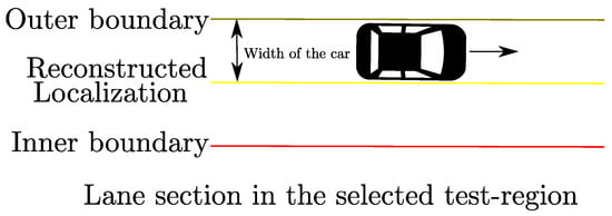 It is essential to carry out model validation to ensure whether large RMS values are indicative of position degradation as these values are estimated by the Applanix solution, being used for performance evaluation of position augmentation methods in this paper. For this purpose, a small section of the test-region is selected in such a way that the test vehicle can be localized approximately. Due to the absence of ground truth, it was ensured that the vehicle was driven close to the outer lane boundary in this test region as shown in Figure 4. For the purpose of localizing the vehicle laterally between the inner boundary and outer boundary of the lane section, the width of test vehicle is considered. For this approximation, the lane dimensions were obtained from an HD map with position accuracy of less than 2 cm, provided by 3D Mapping Solutions GmbH, Holzkirchen, Germany [].