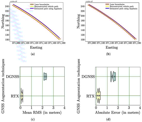 In Figure 5c,d, violin plots showing the distribution of Mean RMS values estimated from the Applanix solution and the calculated Absolute Error for the selected region are provided. In a violin plot, a kernel density estimation is used to represent the distribution shape of data on either sides of the thin grey line. In particular, the wider sections are used to represent a higher probability that members of the population will take on the given value and the skinnier sections represent a lower probability. The thick grey bar in each violin represents the interquartile range and thin grey line indicates rest of point distribution excluding the outliers. Finally, the white dot represents the median value. From the violin plots, it can be observed that high Mean RMS values are indicative of high position error as exhibited by DGNSS and low Mean RMS values are indicative of better positioning performance as exhibited by RTX. As a result of this model validation, the mean RMS values estimated by the Applanix solution are henceforth used as an evaluation metric for the performance analysis across all the test-regions.