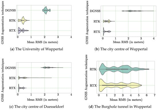 In order to compare the positional accuracy across various position augmentation techniques such as DGNSS, RTK and RTX in the selected test regions, horizontal violin plots showing the distribution of RMS values are used. Figure 6 consists of these horizontal violin plots that depict the positional accuracy of the augmentation techniques across the selected test regions. In particular, Figure 6a depicts the test region around the University of Wuppertal, Figure 6b depicts the test region located in the city centre of Wuppertal, Figure 6c depicts the test region located in the city centre of Duesseldorf and Figure 6d depicts the test region consisting of the Burgholz tunnel in Wuppertal.