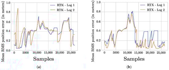 RMS values estimated by the Applanix POS LV-220 system during the course of laps around the University of Wuppertal. (a) Estimated RMS values during RTK position updates. (b) Estimated RMS values during RTX position updates.