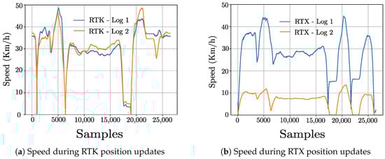 In order to understand the impact of vehicle speed on positioning inaccuracies, the laps recorded aroud the University of Wuppertal are considered again. For this purpose, the vehicle speed for the laps involving RTK and RTX position updates shown in Figure 8a,b are compared against the Mean RMS value plots in Figure 7a and Figure 7b respectively. As general observation for both RTK and RTX updates, the position accuracy is better, i.e., lower Mean RMS values when the vehicle is traveling at low speed or is stationary particularly between samples 15,000 and 20,000. This can be attributed to the fact that GNSS receivers are able to receive position corrections at correct times during lower speeds as compared against higher speeds. As the main objective of the performance evaluation presented in this paper is to analyze various augmentation methods by taking into consideration real-life factors such as the maximum permitted speed in the test region, the dynamic change in traffic situations and various other challenges posed to signal availability, detailed experiments involving different speeds were not performed.