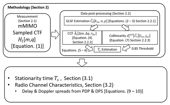 Figure 1 illustrates the methodology followed in this work to obtain the presented results. First, the sampled channel transfer function (CTF) is measured for the investigated scenario using a dedicated mMIMO radio channel sounder (Section 2.1). Then, the GLSF, computed from the CTF using orthogonal multi-window tapers, is used to derive the stationarity time using the collinearity and CCF methods as detailed in Section 2.2. In addition, the PDP and DPS were calculated by projecting the GLSF in the delay and Doppler dimension, respectively, to obtain estimates of the large scale parameters: delay/Doppler spreads, coherence time and bandwidth.