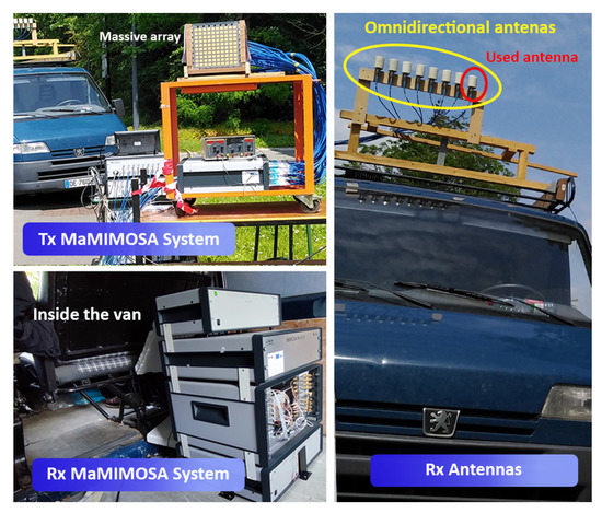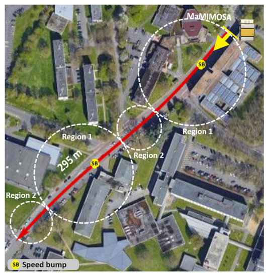 A radio channel measurement campaign was carried out on the campus of Lille University (France) and is presented in Figure 2. This suburban environment is comprised of 3–4 floors buildings spaced 5 to 10 m apart, with dense vegetation with trees up to 30 m high. There is relatively low traffic on the road, with a maximum speed of 50 km/h, but many cars were parked along the boulevard. The Tx is a massive square array of antennas and was installed as a road-side unit (RSU) on the sidewalk at two meters high above the ground. An omnidirectional Rx antenna was placed on the roof of a van at 3 m high, as illustrated in Figure 3. The van was moving away from Tx at a constant 40 km/h speed over a total distance of 295 m, such that an LOS was always present, as shown in Figure 2. The measurement was performed by the real-time radio channel sounder MaMIMOSA with an 80 MHz bandwidth at 5.89 GHz [19,20] corresponding to the frequency band offered by ITS derived from the frequency band 5.9 GHz ITS-G5 and C-V2X technologies.