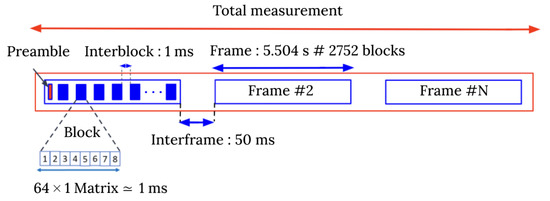 The MaMIMOSA streaming mode was selected to measure the time-varying CTF of the massive radio channel [19] between the massive transmitter and single-antenna receiver (i.e., downlink). It is associated with the frame structure illustrated in Figure 4. Each frame consists of one 51.2 µs preamble followed by blocks of eight orthogonal frequency-division multiplexing (OFDM) symbols. The preamble provides the time synchronization of the frame required to decode the OFDM symbols. Each symbol corresponds to a row of the 8 × 8 massive array and has a duration of 121.92 µs, including the 40 µs cyclic prefix. The automatic gain control (ACG) is performed with the cyclic prefix for each symbol and is used to correct the stored measured complex MIMO matrix. The total number of transmitted OFDM subcarriers per symbol is 8192, which can be uniformly distributed on each antenna element using interleaved OFDM. The frequency space between subcarriers is 12.21 kHz, in line with the basic 4G and 5G numerology. For each Tx-Rx link, frequency samples spaced by eight subcarriers were selected across the 80 MHz bandwidth. The whole array is spanned by sequentially switching between the eight rows. Hence, a mMIMO matrix called block is measured in ∼1 ms, and the frame duration is 5.504 s. The maximum Doppler span is ±250 Hz (∼46 km/h maximum speed) with 0.181 Hz Doppler resolution. The time duration between consecutive blocks and frames was manually set to 1 ms and 50 ms, respectively. Five frames were measured during the driving test giving a measurement time total of 27.18 s and a total of 13,760 blocks (i.e., 880640 CTF). The total number of frames that can be measured by the system solely depends on the available hard drive space. For each Tx-Rx link l, the sampled CTF can be represented as follows: