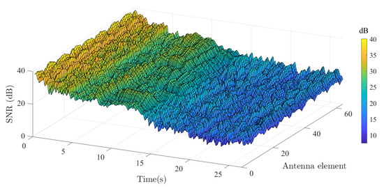 Here, the GLSF was derived from the measured CTF, and was computed as shown in Section 2.2 using 10 interleaved GLSF corresponding to 934.34 ms using the two methods (i.e., CCF and collinearity) described earlier. This value is deliberately larger than the local stationarity time of 567 ms reported in [6] for a similar scenario. In order to obtain faithful estimate values across the whole array, the signal-to-noise ratio (SNR) values were calculated from the GLSF. As it is shown in Figure 5, the SNR level continuously decreases since the van is moving away from Tx with values ranging from 40 to 10 dB. The SNR is found to be spatially uniform with time-averaged deviation dB and median dB. This also indicates that no significant masking effects occurred during the measurement scenario.