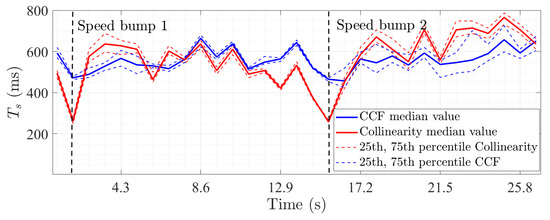 Figure 6 presents the 25th, 75th percentiles and median value computed from the spatial distribution of using both methods. A 0.9 threshold was used for the collinearity method. The results show an averaged median value for of 568 ms and 565 ms for the CCF and collinearity approaches, respectively, indicating that, on average, these two methods behave similarly. Nonetheless, it is observed for two specific time frames that the values obtained with the collinearity method are much lower than those computed from the CCF method. This effect is attributed to the presence of two speed bumps along the driving test shown in Figure 2. Indeed, the position of the Rx antenna was brutally modified during a short time of around 100 ms less than the CCF window. It is noteworthy that the collinearity method highlights this rapid change well in the propagation channel statistics, whereas the CCF does not. The discrepancy between the results of the two methods was discussed in [6]. Furthermore, for both methods, the values are also observed to be spatially uniform during the first second and between ∼9 and ∼13 s. This can be explained by the scattering properties of the environment, which will be discussed in more detail later.