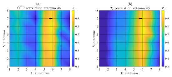 Spatial correlation computed from (a) the time-varying Ts values and (b) CTF for antenna #46 (black arrow).