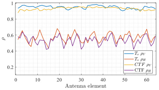 In addition, the spatial distribution of computed using the CCF method was investigated with greater depth across the array by evaluating its correlation properties. For each antenna, the values over the total measurement time were stacked into a vector. Then, the correlation between a reference antenna vector and all other antenna vectors was computed. As an example, Figure 7a presents the results of this analysis for the arbitrary antenna #46 (indicated by the black arrow). The data show that is strongly correlated along the vertical (V) axis compared to the horizontal (H) axis with average values of and , respectively. This indicates that the characteristics of the radio channels are shared among each link of the vertical array. This effect is attributed to the measurement scenario for which scatterers in the elevation plane are scarce in contrast with the azimuth plane. Consequently, it is expected that the distribution of the MPC parameters (i.e., delay and angular spreads) along V is relatively low, as will be demonstrated later in the paper. This effect, critical for the design of RSU arrays, is also confirmed by the similar behavior of the CTF correlation for the same reference antenna in Figure 7b. Figure 8 presents the averaged correlation of and the CTF for all antennas of the array along the H and V axis. The results demonstrate that the behavior of the correlation along H and V is highly consistent with the #46 antenna analysis. is observed to be relatively smooth for all antennas, whereas a periodic variation in is found, thus suggesting that the spatial properties of the MPC change at a larger rate compared to the array size along H. These findings are in line with previously reported results such as in [21].