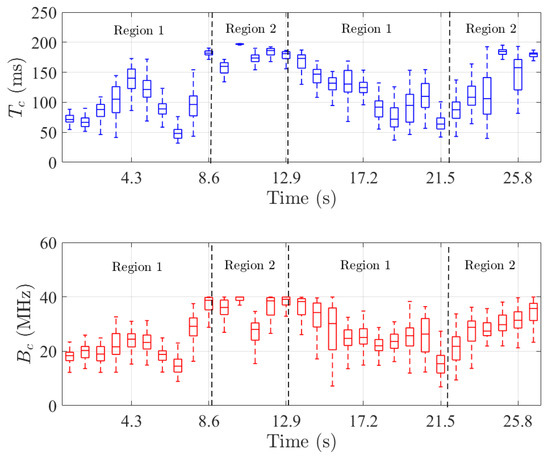 Thus, the stationarity region is much larger than the coherence region for doubly underspread channels [22]. Figure 9 shows the boxplot spatial distribution of and as a function of time. First, it is found that and are always significantly lower than and with median values from 50 to 190 ms and 10 to 40 MHz, respectively. This confirms the doubly underspread property of the measured scenario. Nonetheless, the data show that the statistics vary as a function of time due to the nature of the investigated scenario. Moreover, and are found to be highly correlated with a Pearson correlation coefficient of 0.89. To provide a deeper understanding of these variations, the following paragraph explores in detail the large scale parameters of the measured radio channel.