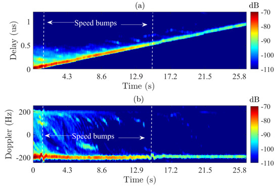 The LOS delay is linearly increasing with a maximum delay of 0.98 μs that is related to the change in the propagation path length of 295 m, and a negative Doppler shift of Hz which is in line with Rx moving away from Tx at a constant speed of 40 km/h. A large set of high-energy MPC can be observed within the first nine seconds with negative and positive Doppler shifts. This is attributed to strong scattering from the front and side buildings during the first half of the driving test, whereas few paths are seen during the second half. In addition, a variation in the Doppler shifts of the LOS is observed at the location of the speed bumps.