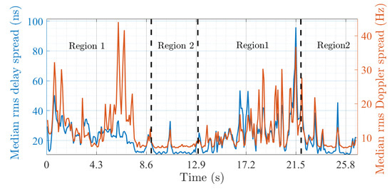 The MPC richness is analyzed from the analysis of the RMS delay and Doppler spread computed after the time-varying PDP and DPS with a 20 dB threshold [6] (Figure 11). Two regions with specific shadowing characteristics are found that can be physically linked to the geometrical configuration of the investigated scenario (see Figure 2). The first (region 1) corresponds to the first 9 s and between ∼13 and 22 s. The second (region 2) is between ∼9 and 13 s and after 22 s. Region 1 is MPC-rich which can be attributed to buildings surrounding Rx during the first and second half of the driving test. On the other hand, region 2 is MPC-poor and corresponds to the transition in-between due to masking buildings and a lack of strong scatterers. Similarly to and , the results also suggest a high degree of correlation between the delay and Doppler spreads with an average Pearson correlation coefficient of 0.72.