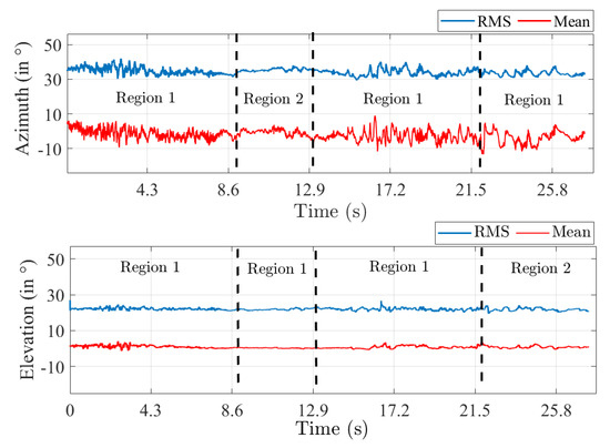 Finally, the spatial structure of the MPC was investigated by computing the RMS azimuth and elevation angular spreads and associated mean values from the PDP using a classical beamforming approach. The results shown in Figure 12 highlight the fact that the MPC geometrical structure does not vary along the driving test. The RMS angular spreads and mean values are found to be nearly constant with time. An RMS of ∼35 and ∼22 in azimuth and elevation was computed on average, respectively. A mean value of ∼0 for both azimuth and elevation is obtained corresponding well to the LOS between Tx and Rx. Nonetheless, the spread values in azimuth exhibit a larger deviation in region 1 compared to region 2 again due to a richer scattering environment. Finally, the spatial correlation along V that was reported earlier can be corroborated by the fact that the spread values are lower in elevation than in azimuth. It can be safely concluded that horizontal arrays are more favorable for this scenario since the MPC richness appears naturally stronger in the horizontal plane.