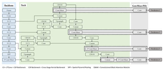 The detailed framework of the suggested model is shown in Figure 4. The general architecture is similar to the baseline YOLOv5 model. The significant changes to the architecture come in the form of the prediction heads of the model. First, as opposed to the original YOLOv5 architecture, there is an additional prediction head to facilitate detection of small objects, making the resultant number of prediction heads sum up to four. The effectiveness of adding a prediction head to the existing three in the YOLOv5 model has been verified by the TPH-YOLOv5 architecture. Hence, we are just following suit. The next change to the prediction heads of the YOLOv5 is the usage of ConvMixers in them. TPH-YOLOv5 has attained quality results by using transformer encoders in the prediction heads. We have used ConvMixers in a similar way. The rationale for using the ConvMixers was justified in the previous section, and each of the prediction heads along with the final part of the backbone in the suggested architecture have ConvMixers. Finally, CBAM has been fused to different positions in the neck of the suggested architecture. This helps focus on the more significant use of the images when the field of view contains a large area in real life. The use of CBAM is also helpful, as seen in the TPHYOLOv5 architecture. In Figure 4, the C3 is the combination of three convolutional blocks along with the CSP bottleneck. The structure of the C3 block and the details of the CSP bottleneck are shown in Figure 5. To make the most of the available data and to make our model robust to simple variations, we have also adopted data augmentation strategies such as Mosaic and Mixup during training.