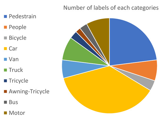 We used the VisDrone-DET2021 dataset [51], which was used in the VisDrone-DET2021 Challenge, an ICCV 2021 workshop. The same dataset has been used previously in the VisDrone2019 [52] challenge. The goal is to predict the bounding boxes of objects of predefined classes with real-valued confidence. The dataset consists of 6471 images for training, 548 images for validation, and 3190 images for testing. There are ten object categories: pedestrian, person, bus, car, van, truck, bicycle, awning-tricycle, motorcycle, and tricycle. Figure 6 shows the distribution of the number of instances of the labels of each category in the VisDrone2021 dataset. Furthermore, Figure 7 shows a few instances of images in the VisDrone2021 dataset illustrating the variation of the dataset in terms size of the objects, background, number of objects in the frame, and motion of the objects.